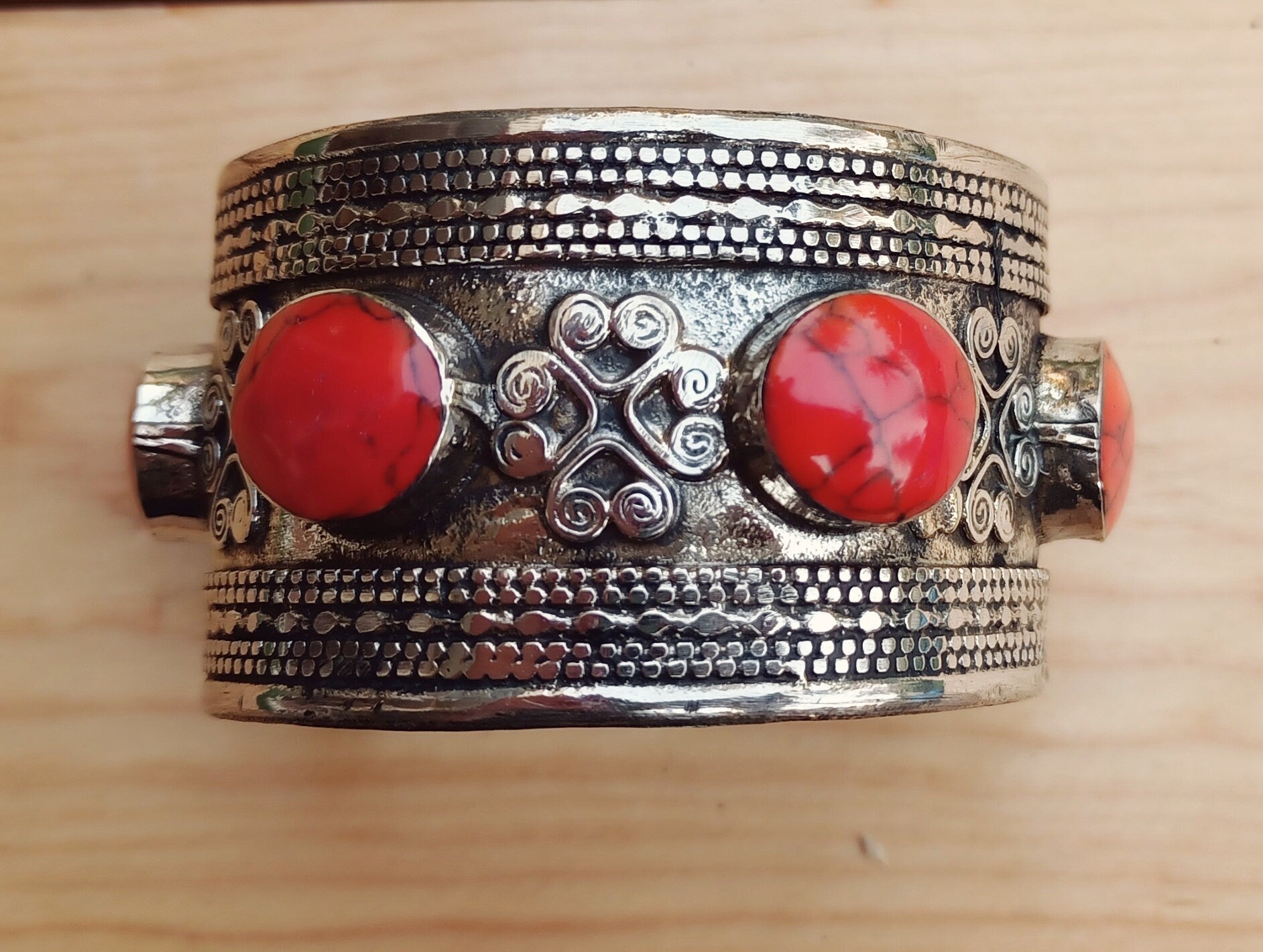 The bracelet features a salmon colored afghan onyx stone.This stone is 2 inch long in an oval shape.The cuff is light and adjustable to fit every wrist size by squeezing gently!