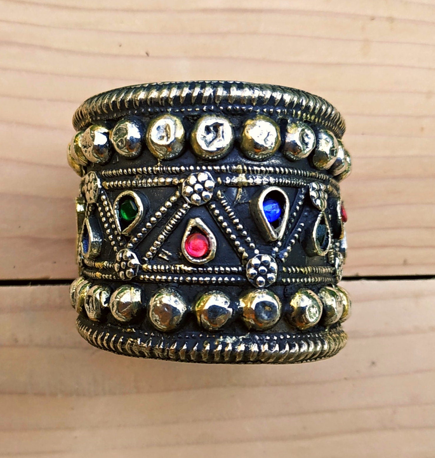 This cuff is made out of silver (not silver plated).The cuff is hand carved along the whole band.The cuff is decorated with gemstones in red and green.Not too heavy on the wrist.