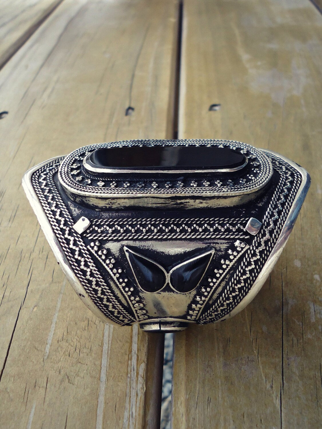 This Intricate metallic cuff bracelet is hand carved,With motifs from Islamic art adorning the band of the cuff.The contemporary look gives it an edge over the vintage pieces.The band had aged but the beautiful carving is intact.Heavy metal carving with a silver color between the black aqeeq stones enhancing the beauty.