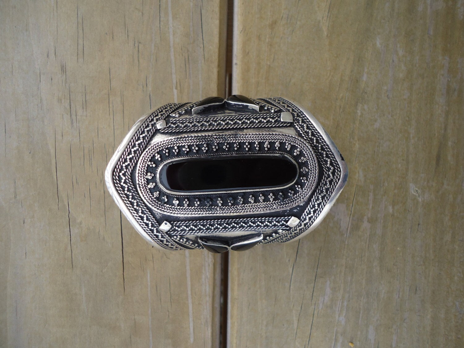 The cuff has a huge black agate in the center while the band is hand carved with detail.The cuff is adjustable.Metal"gilit
