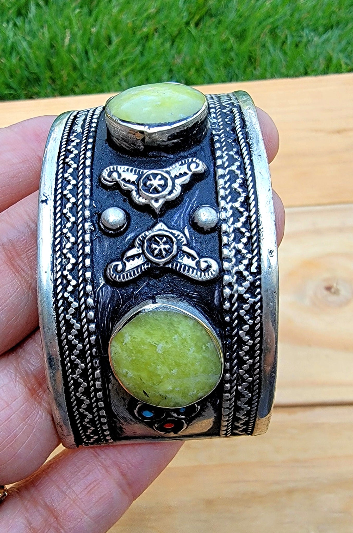 A row of beautiful green malachite stones set in gilit silver.The tiny stones are placed on the corners on each side,bestowing more beauty and mesmerizing touch to it.