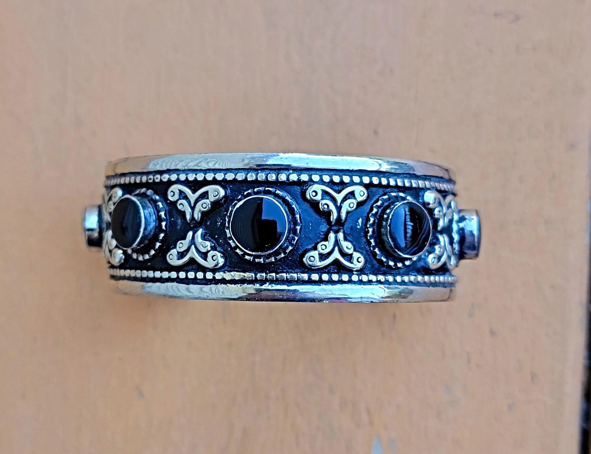 has Heavy metal carving with a silver color between the maroon aqeeq stones enhancing the beauty.