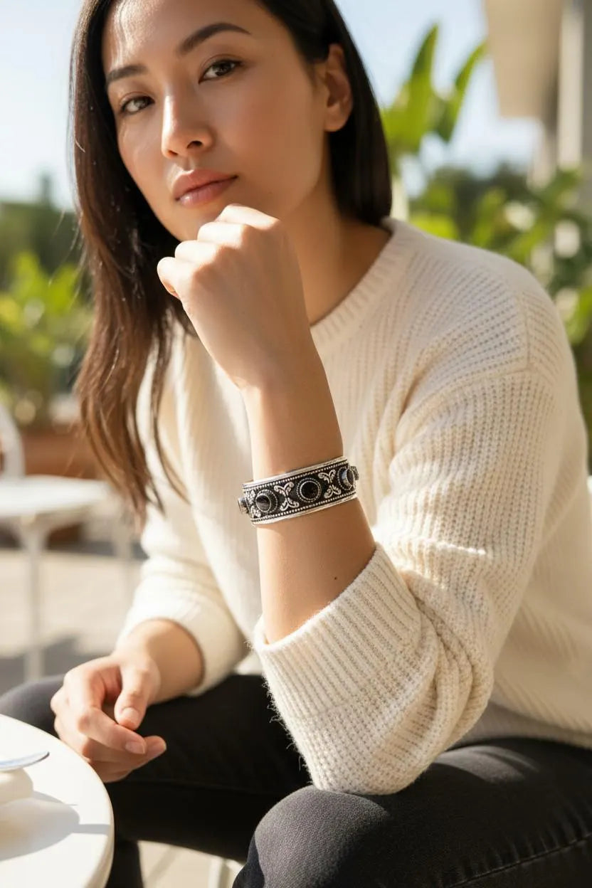 This Intricate metallic cuff bracelet is hand carved,With motifs from Islamic art adorning the band of the cuff.The contemporary look gives it an edge over the vintage pieces.The band
