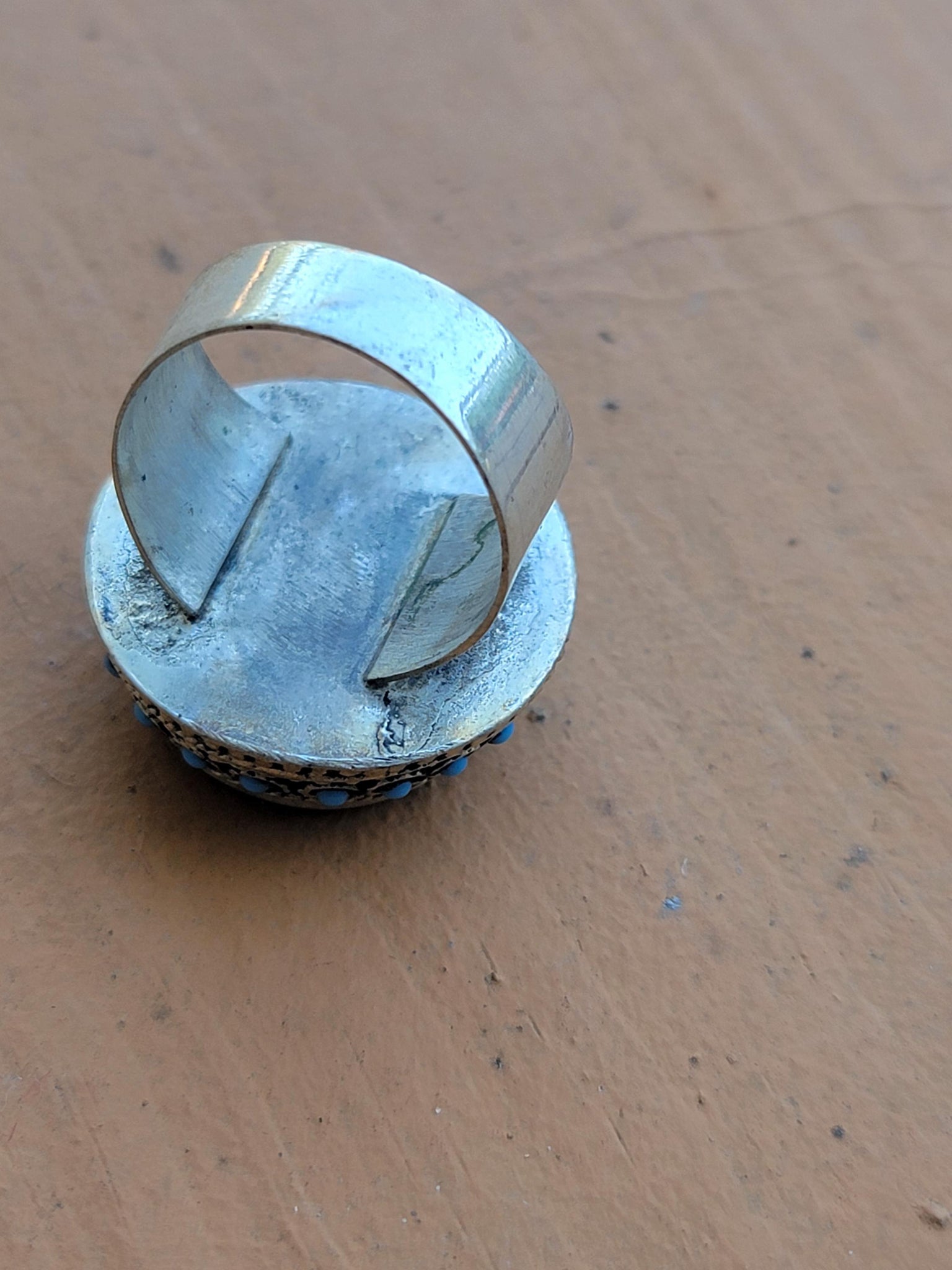 Breathtaking Turquoise color ring set in the most beautiful and intricate Kazakh setting.This ring is a perfect combination of a blue onyx and molded foil silver engravings.