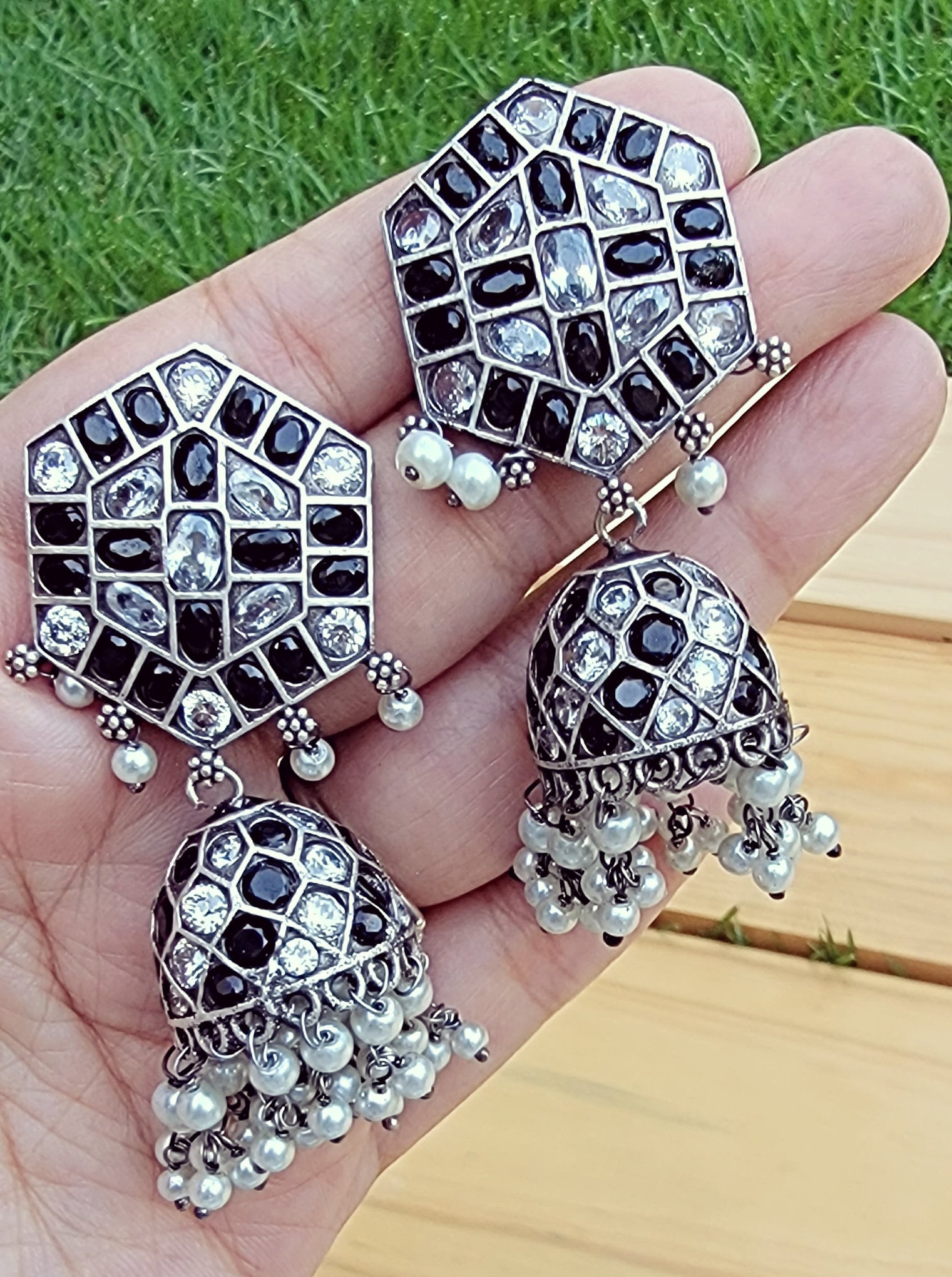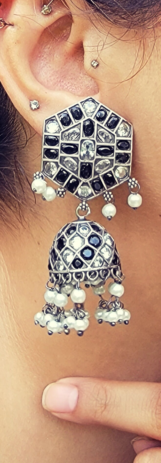 Black Kundan Silver Jhumka Earrings: Indian Tribal Jewelry