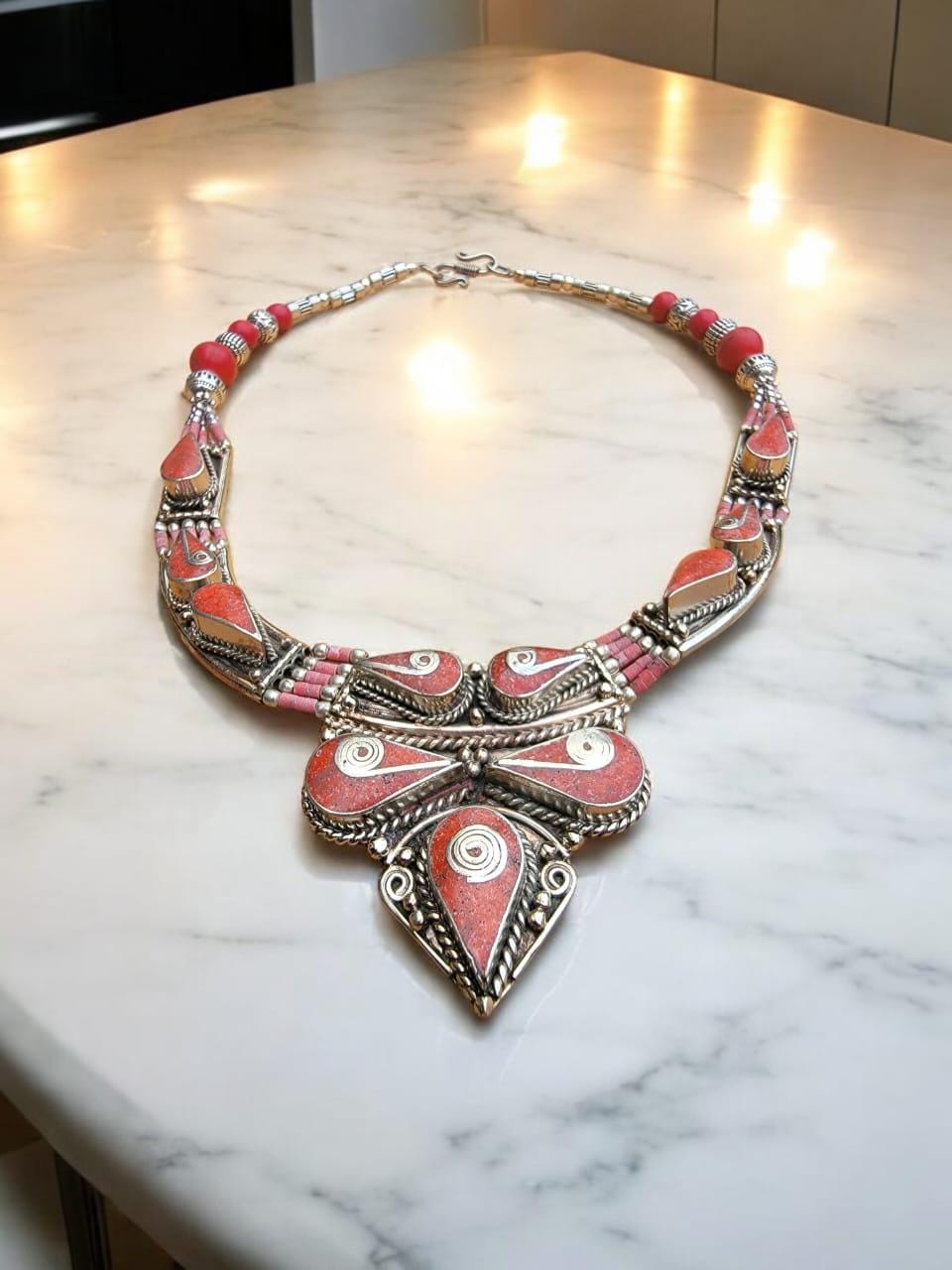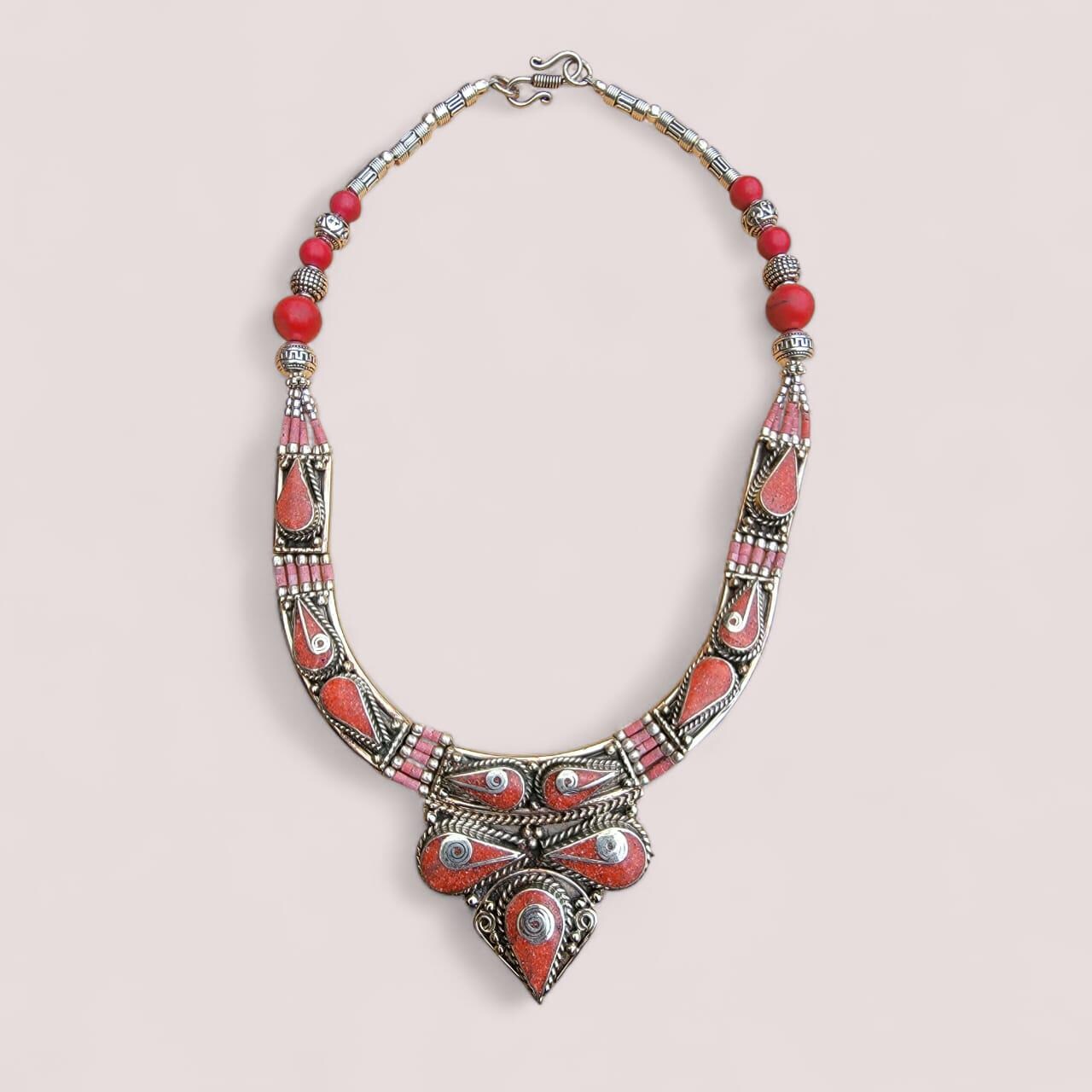A unique Nepalese necklace decorated with traditional tibetan jewelry making techniques. (each necklace slightly differs, making this a truly unique piece).