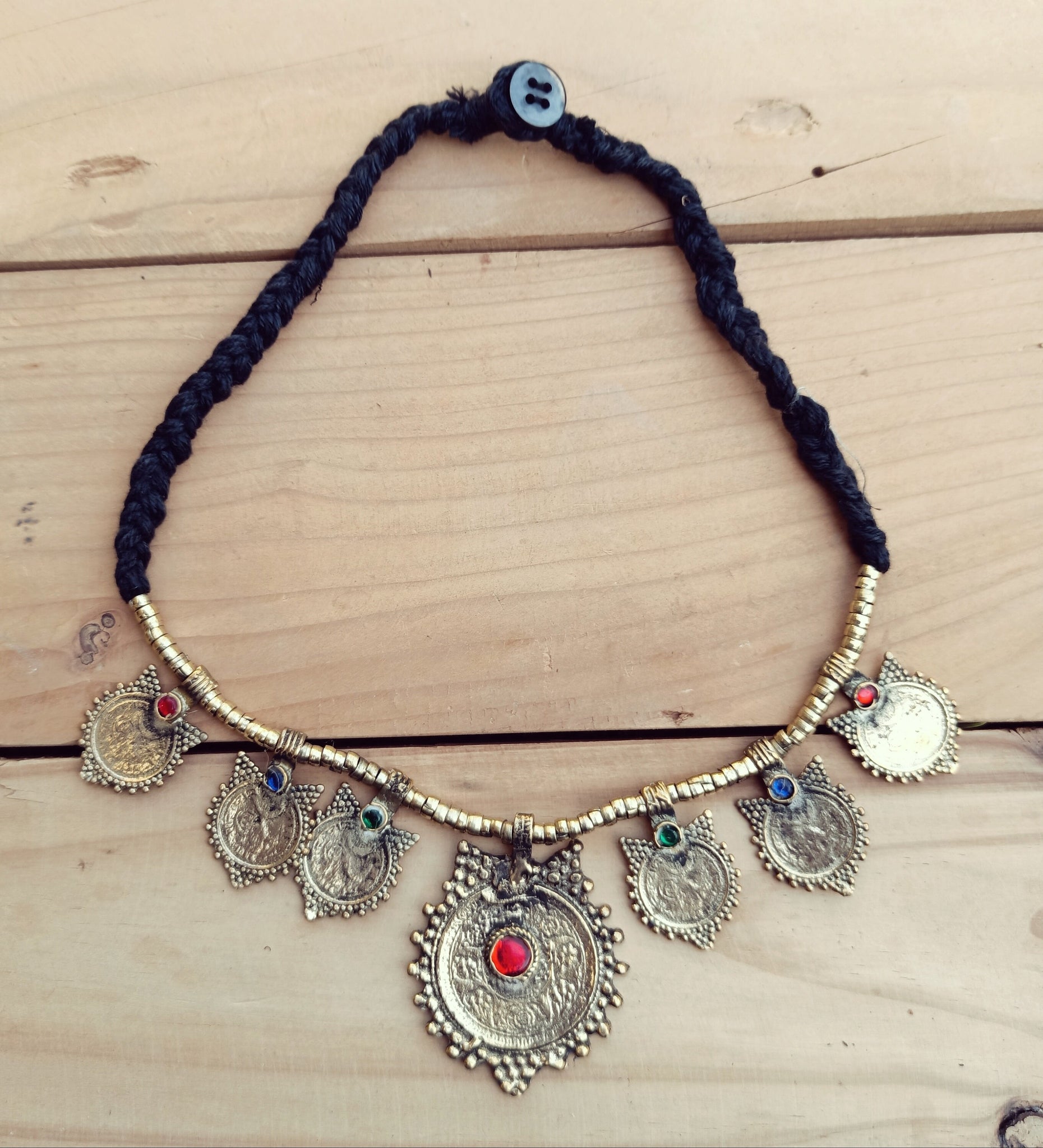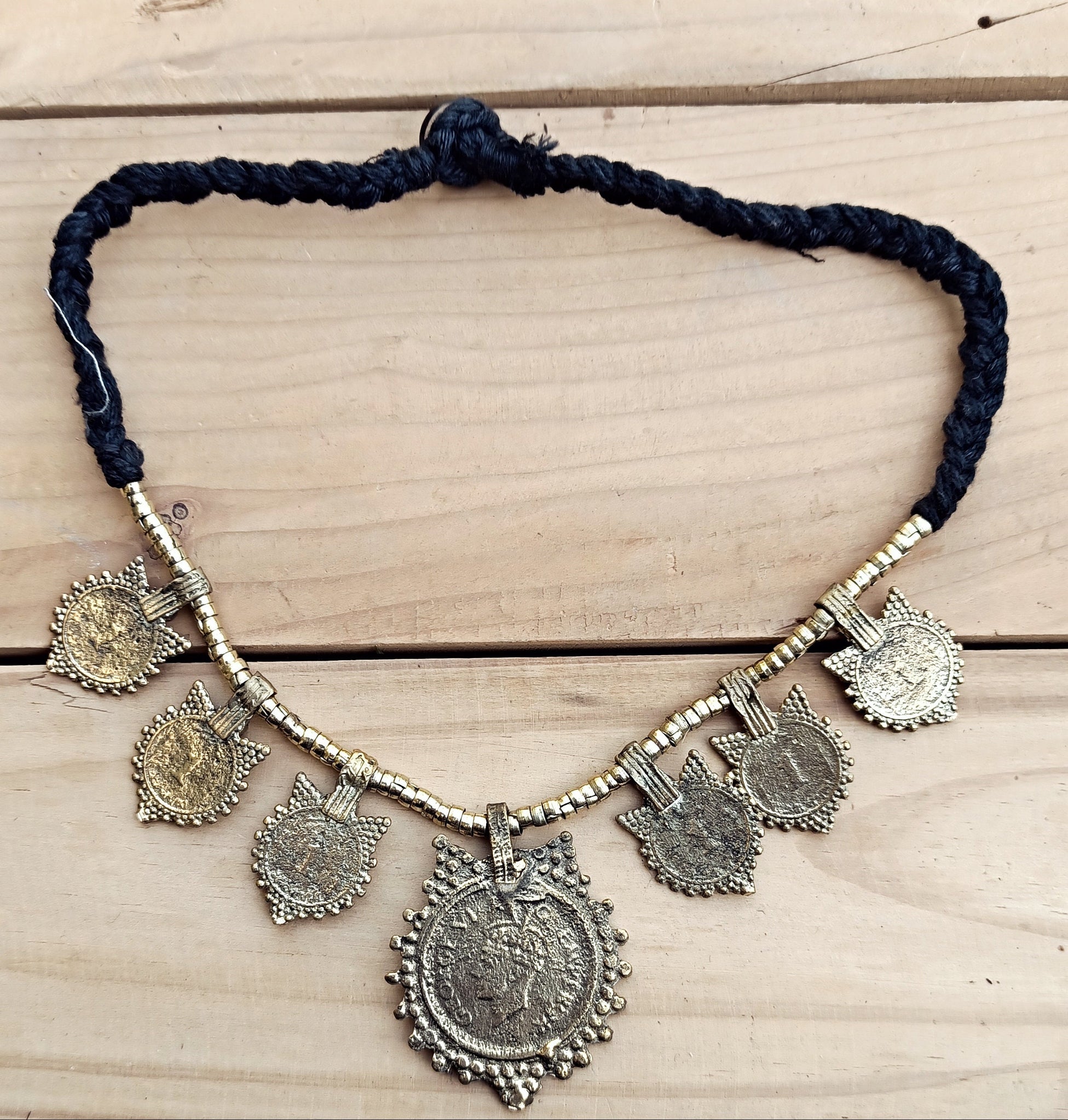 This beautiful handmade necklace was constructed in the mid 19th century.It measures approx. 20 inches from end to end and has a button closure. Fabric backing attached to metal beads and coins.The center pendant is constructed out of a vintage coin with attached dangles and beads.