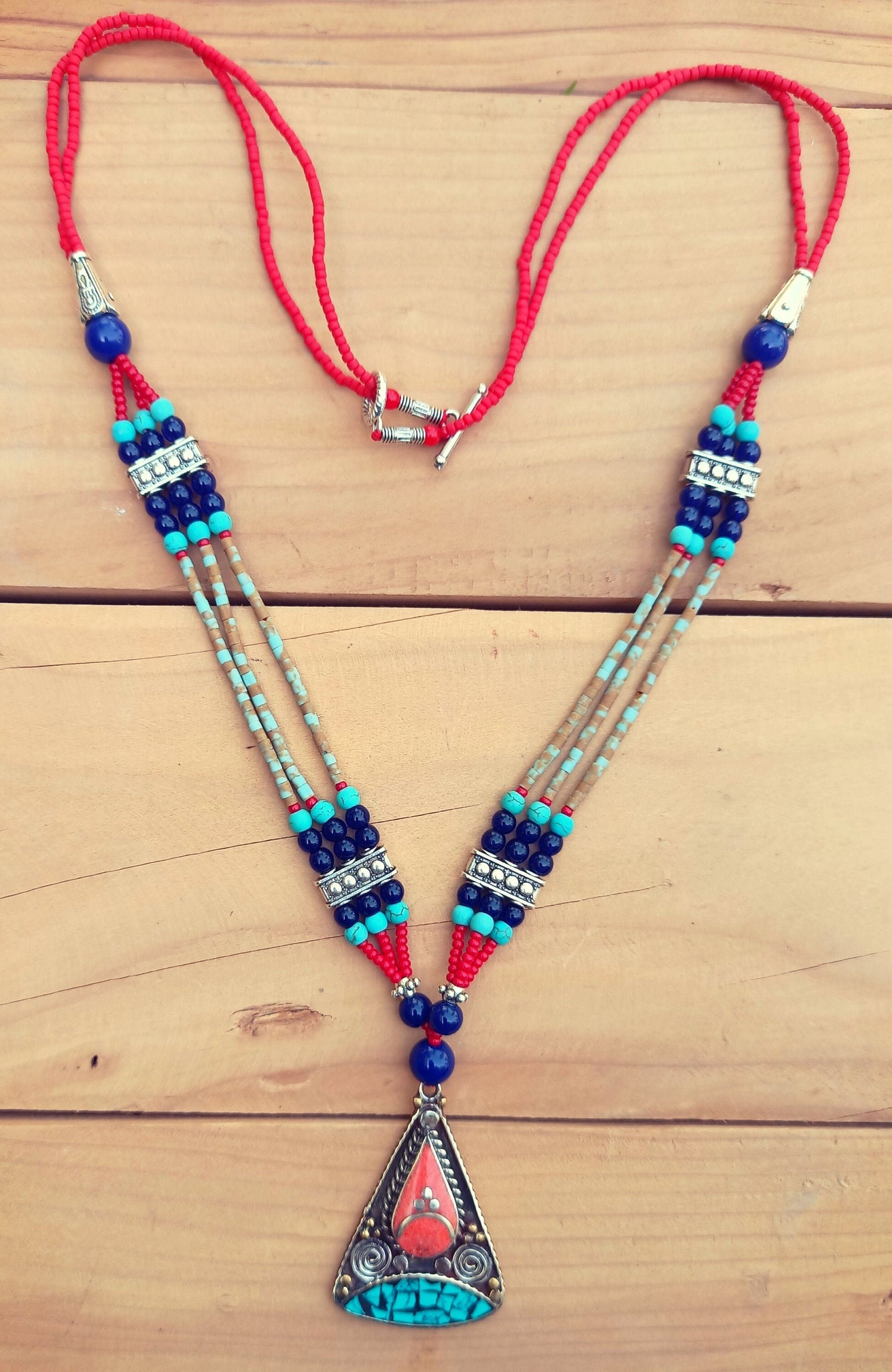 Stunning large pendant with great detail and carved stone design!!! This is a great statement piece! The pendant is shaped into a large circle dome attached to a large turquoise bead.Lapis chain to add contrast.