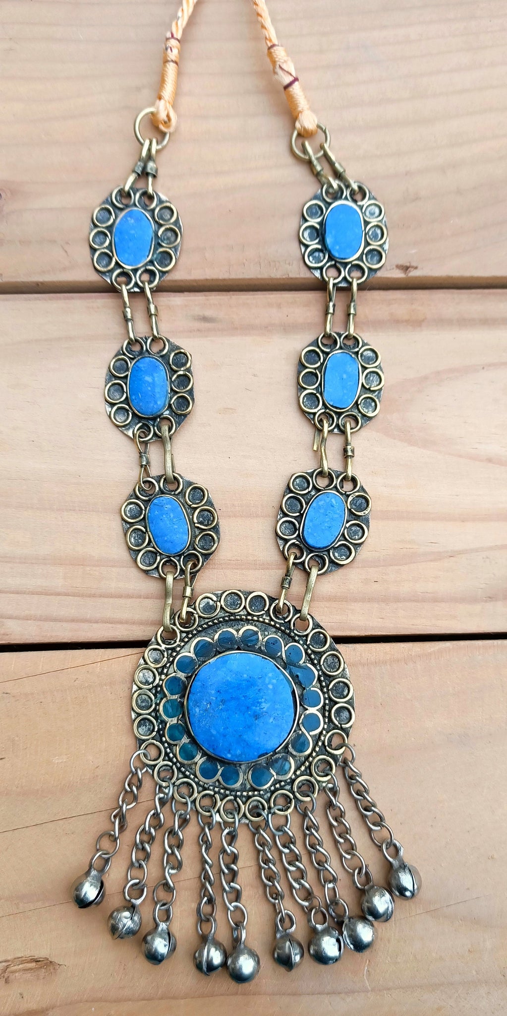 This wonderful vintage necklace was handcrafted with a large stone studded bead as the Central Pendant.The necklace has a number of different shape of beads in blue onyx inlay stone.