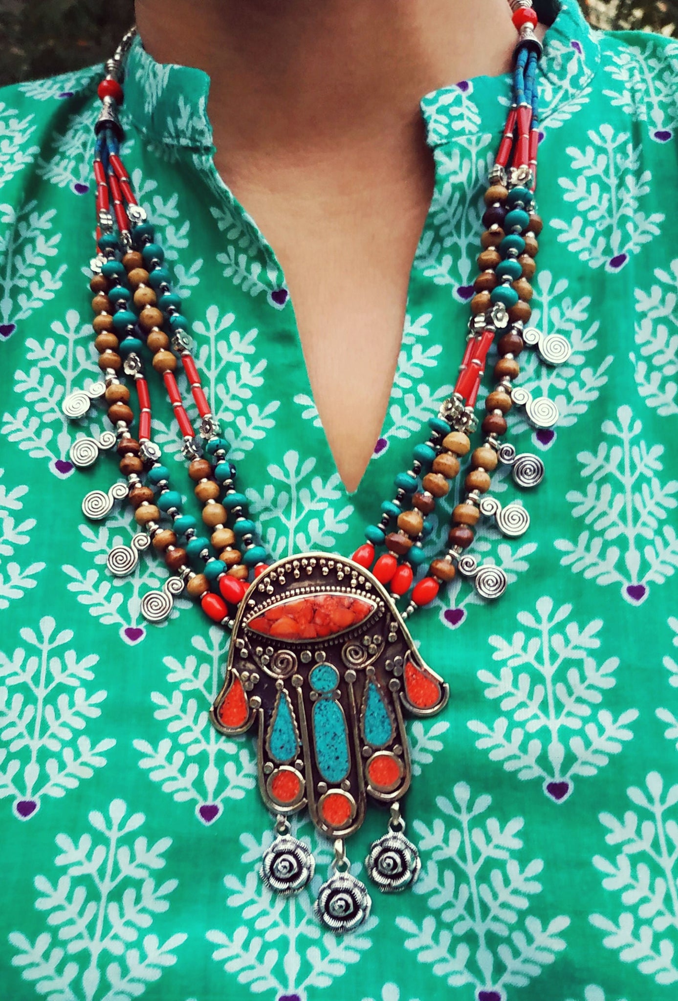 A unique Hamsa necklace decorated with squares of turquoise and coral chips, connected with small turquoise, coral and silver beads forming hamsa (hand)The small pendants feature a gorgeous turquoise and coral design (each necklace slightly differs, making this a truly unique piece).