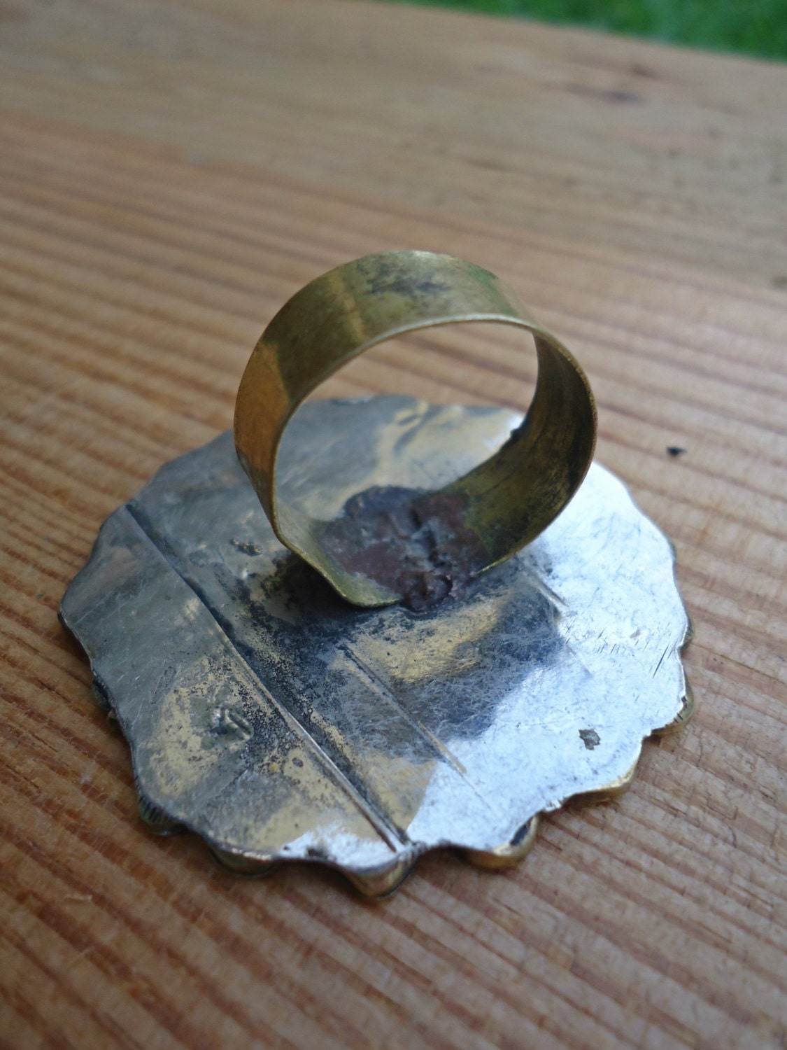 The Body of the ring is sitting on a band made out of german silver.On top of it is elevated a rich colored turquoise and coral stones.The ring was made by Kuchi tribesmen residing along the Peshawar Border in Pakistan.