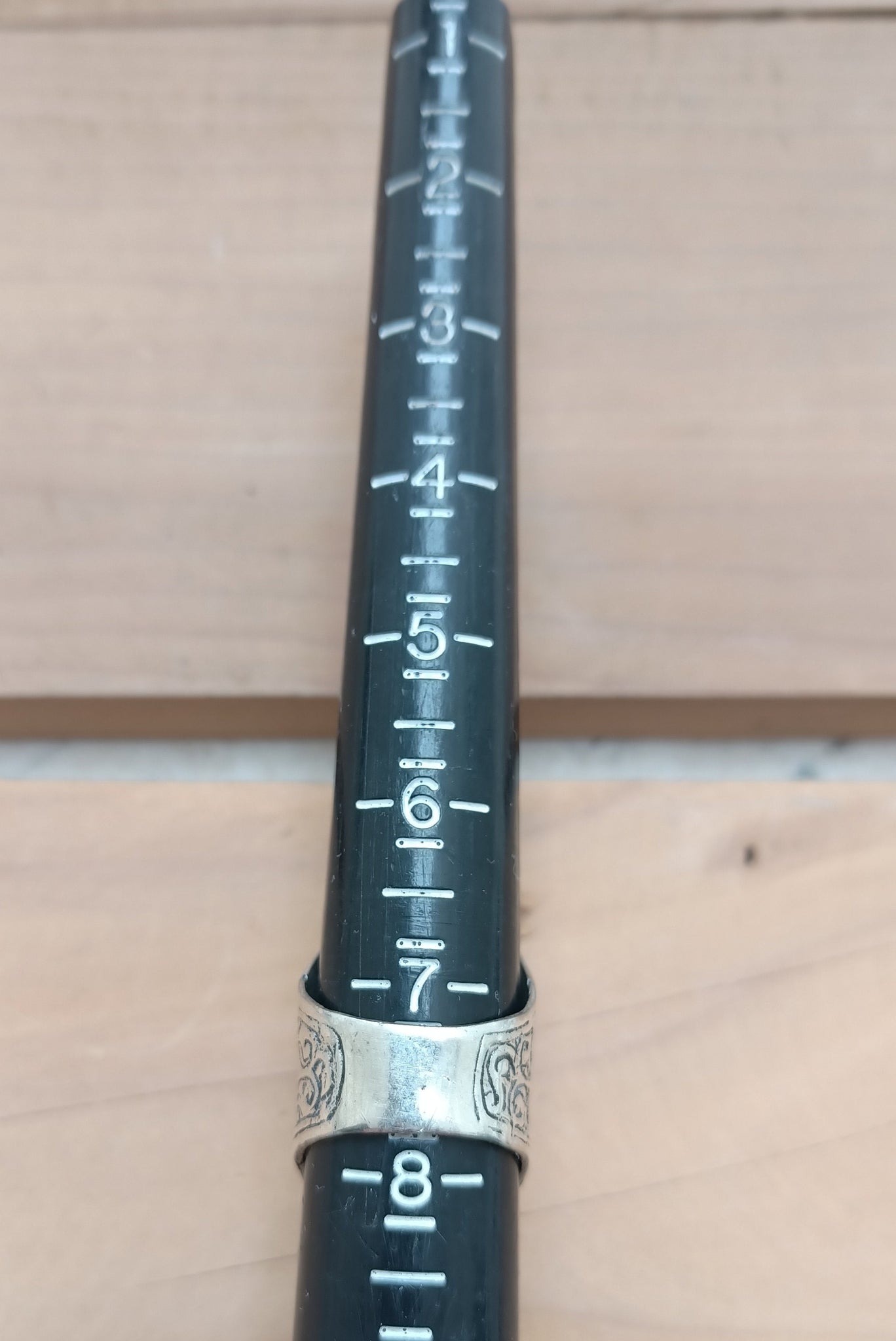 The ring has some real silver wire work going on in the construction.If I take age, handwork, silver content, rarity and other such qualities into consideration I would say these rings should be worth a lot more money.They have a solid silver base(that slightly shows sings of age) with very intricate silver wire work. that depicts geometric and floral motifs.