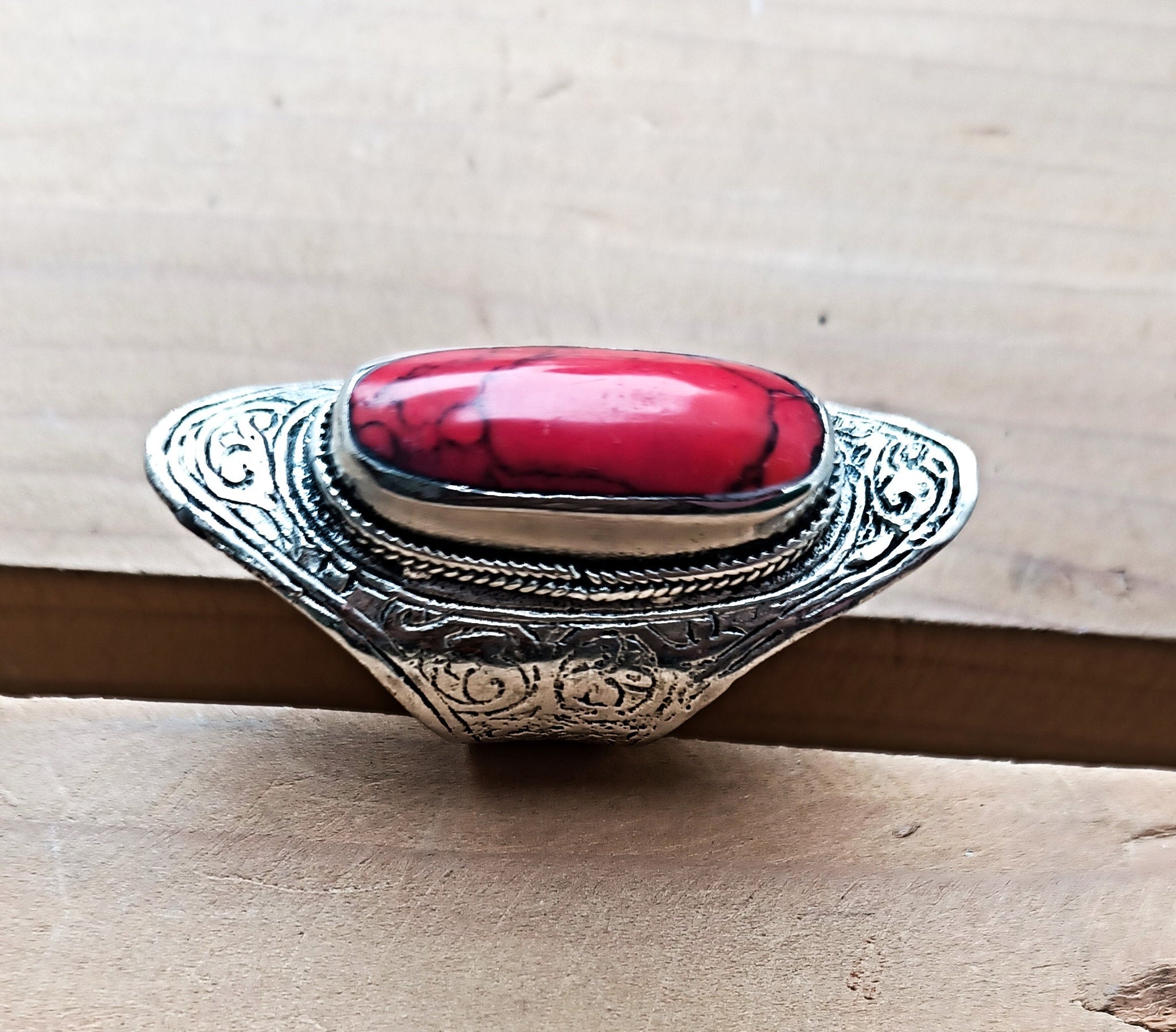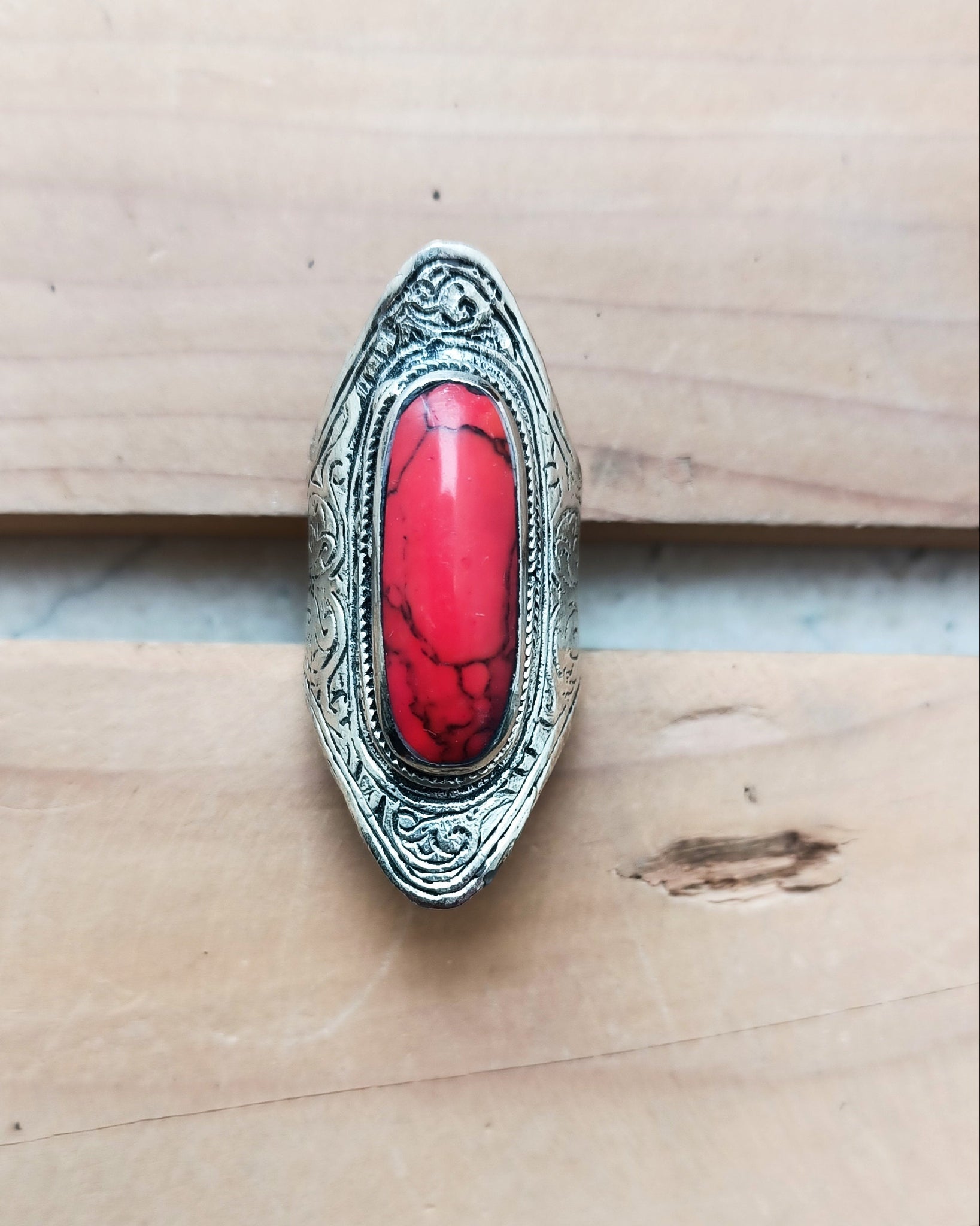 Coral stone ring- Afghan jewelry- Saddle ring. Coral statement ring.Ethnic Stone rings. Bohemian Afghan ring. Gypsy Nomadic Ring- boho ring
