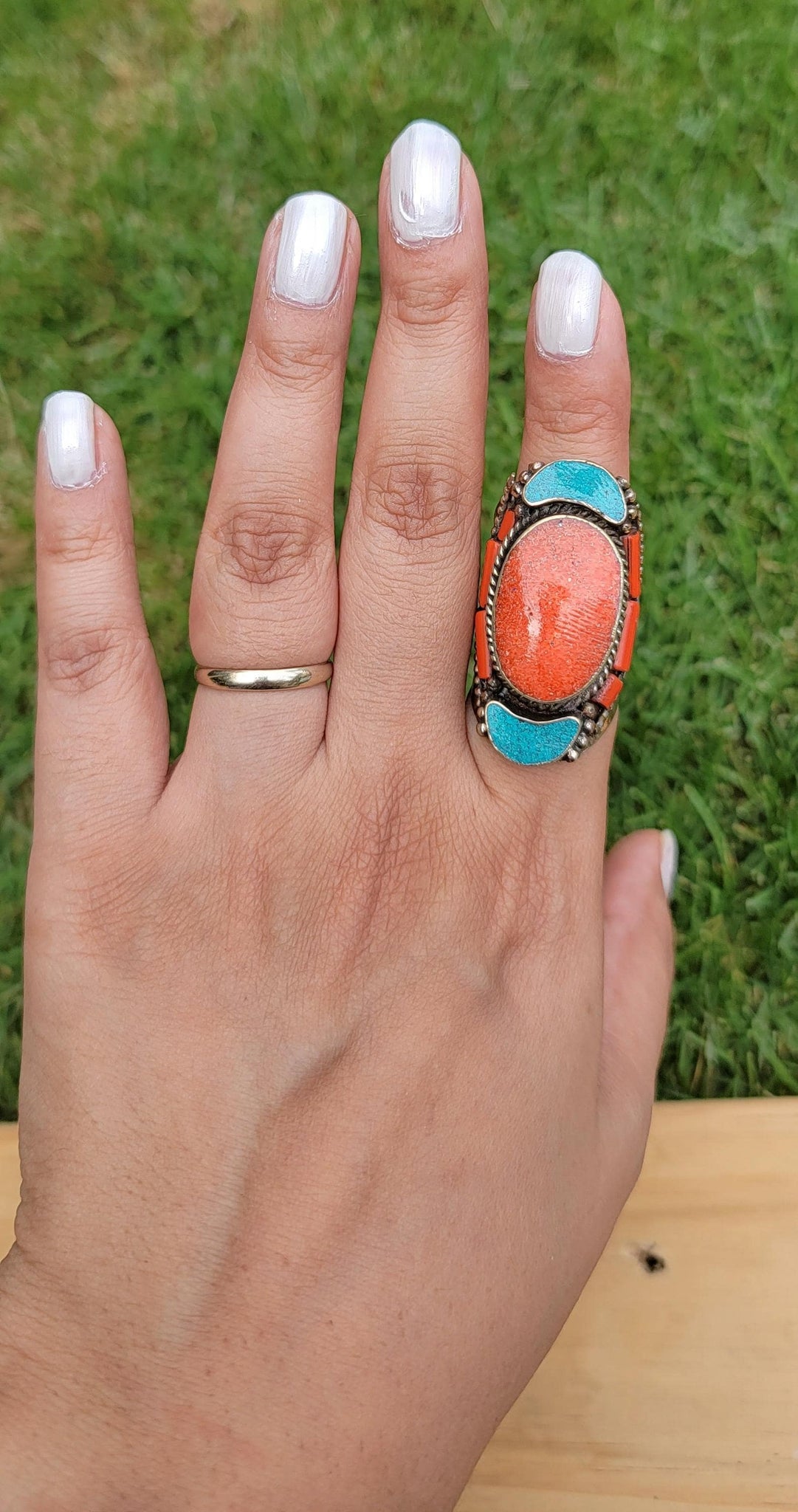 Experience the beauty of nature with this Handmade Coral Ring combined with good quality, Turquoise. A beautiful, orange stone is surrounded by details that include a nice, carved bottom border. Beautiful, deep blue green turquoise branch adds a touch of the sea to this beauty.