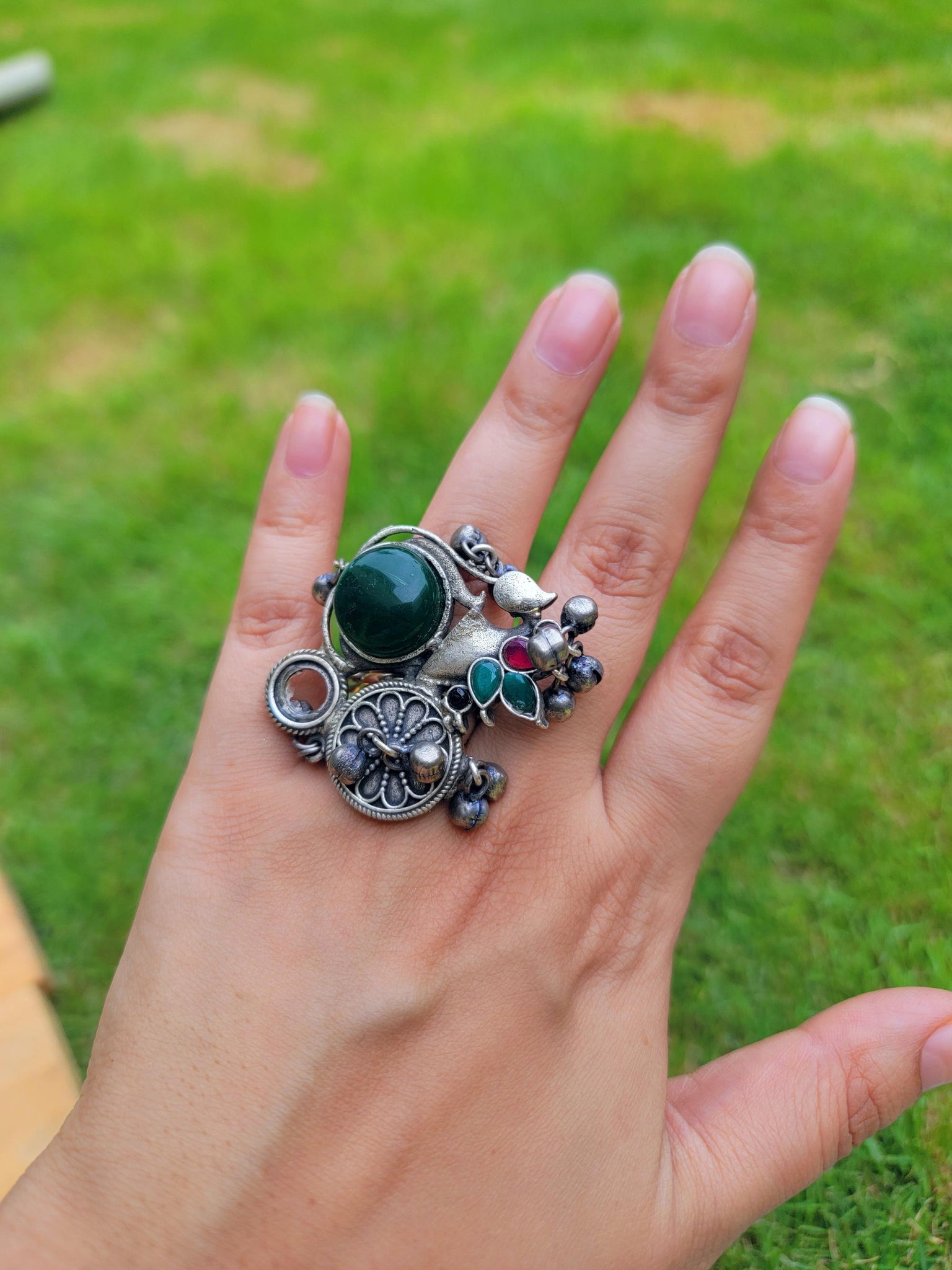 This beautiful and unique Multi stone mosaic ring is from Jaipur India. The ring is set in brass and adorned with small pieces of turquoise and coral along with brass polished in gold to accentuate the ethnic Indian look.
