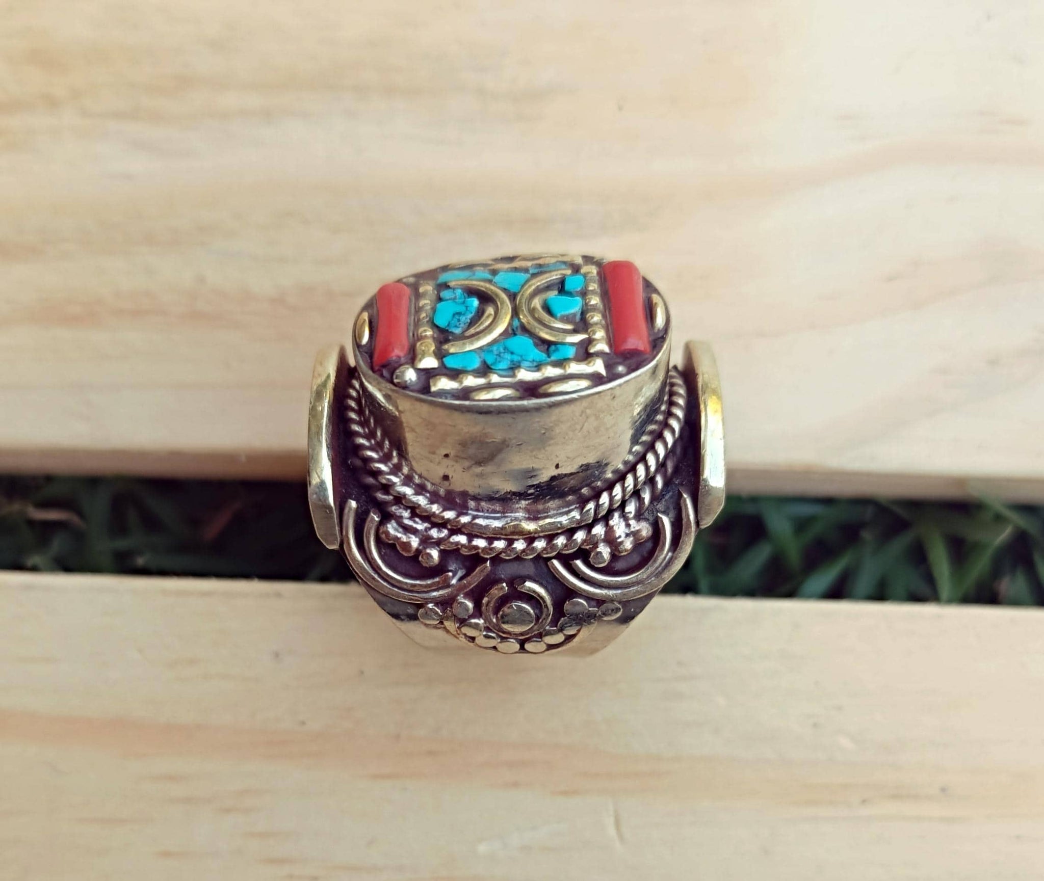 Turquoise & Coral Statement Ring: Tibetan Silver Brass Jewelry, Size 7