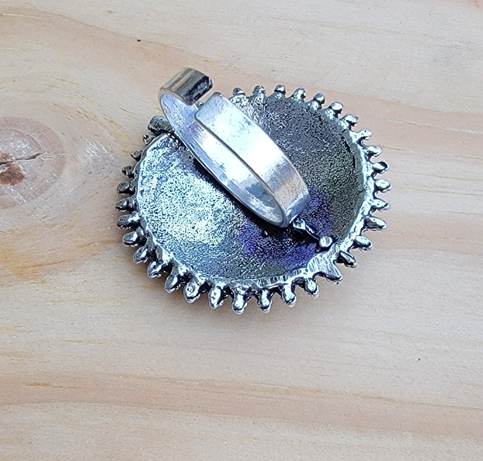 Gorgeous Old one of a kind Dome ring with glass stone.The ring is probably 40 year old.Shaped into a coin,The technique used on the ring is metal stamping.The metal work and hand carving is explicit.I have not polished the ring and there are a few signs of age old patina.Perfect vintage condition.