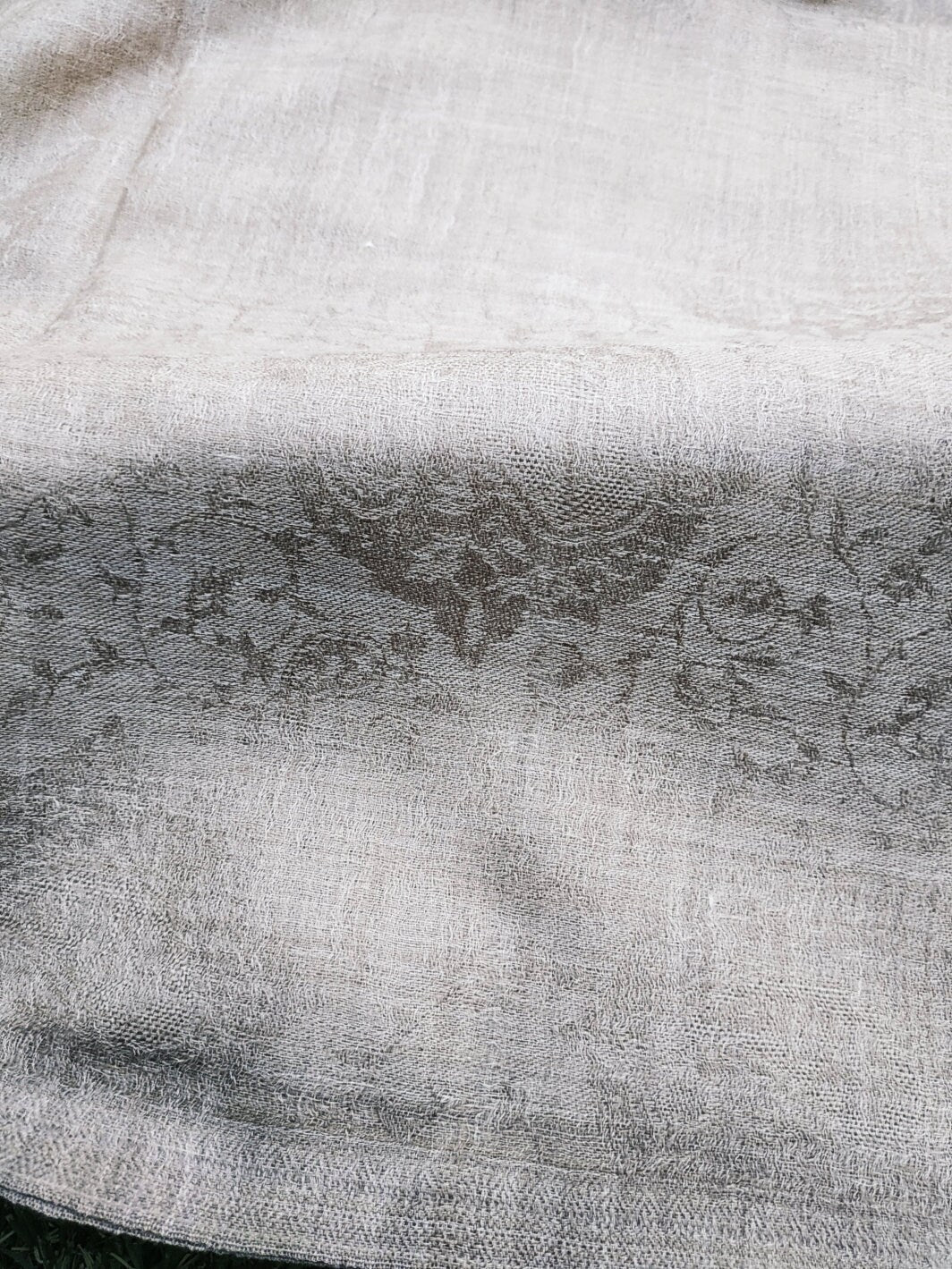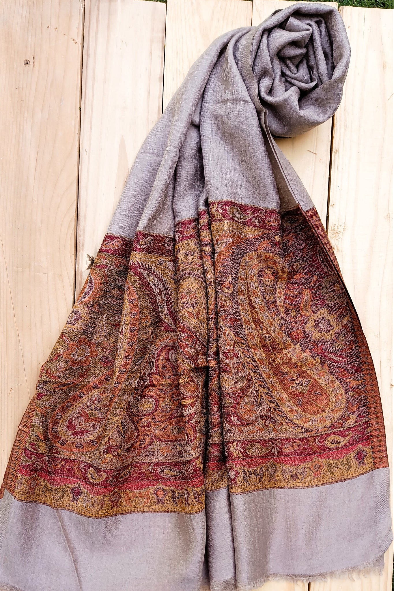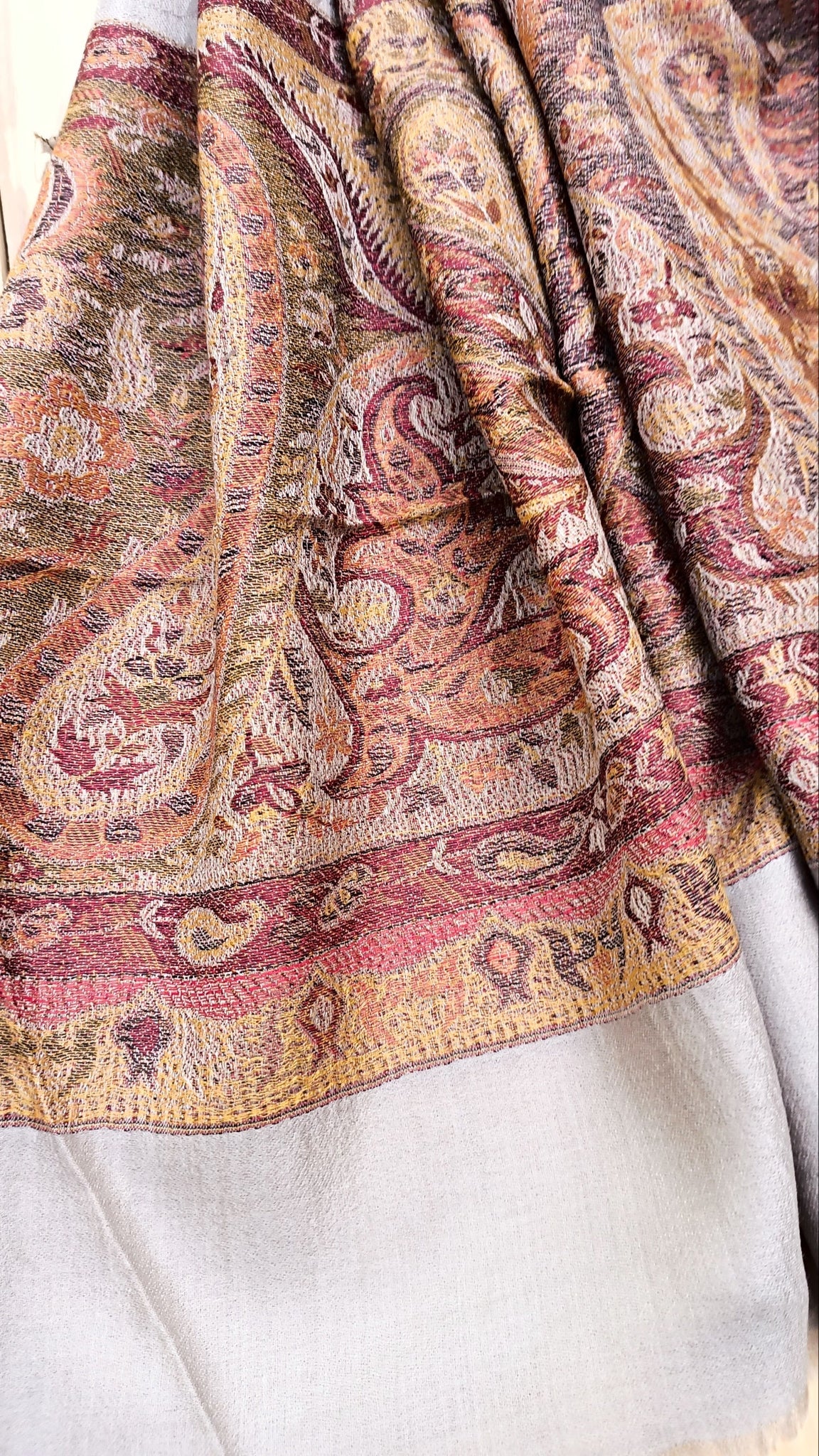 This particular piece is 100% Pure Cashmere and handwoven in basket weave with jamawar border which makes the scarf very light weight and incredibly