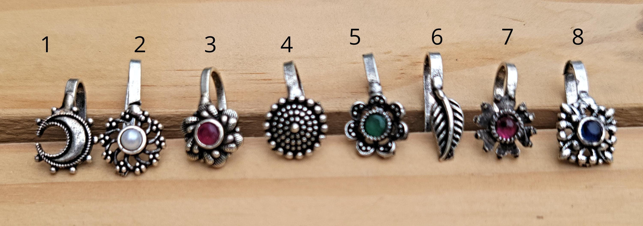 These nose rings feature a small phool(nath:Nose,Phool:flower).The best part is that anyone can wear it even without a nose piercing because there is a L shaped hook attached to the nath phool that can be adjusted to fit inside the nose.