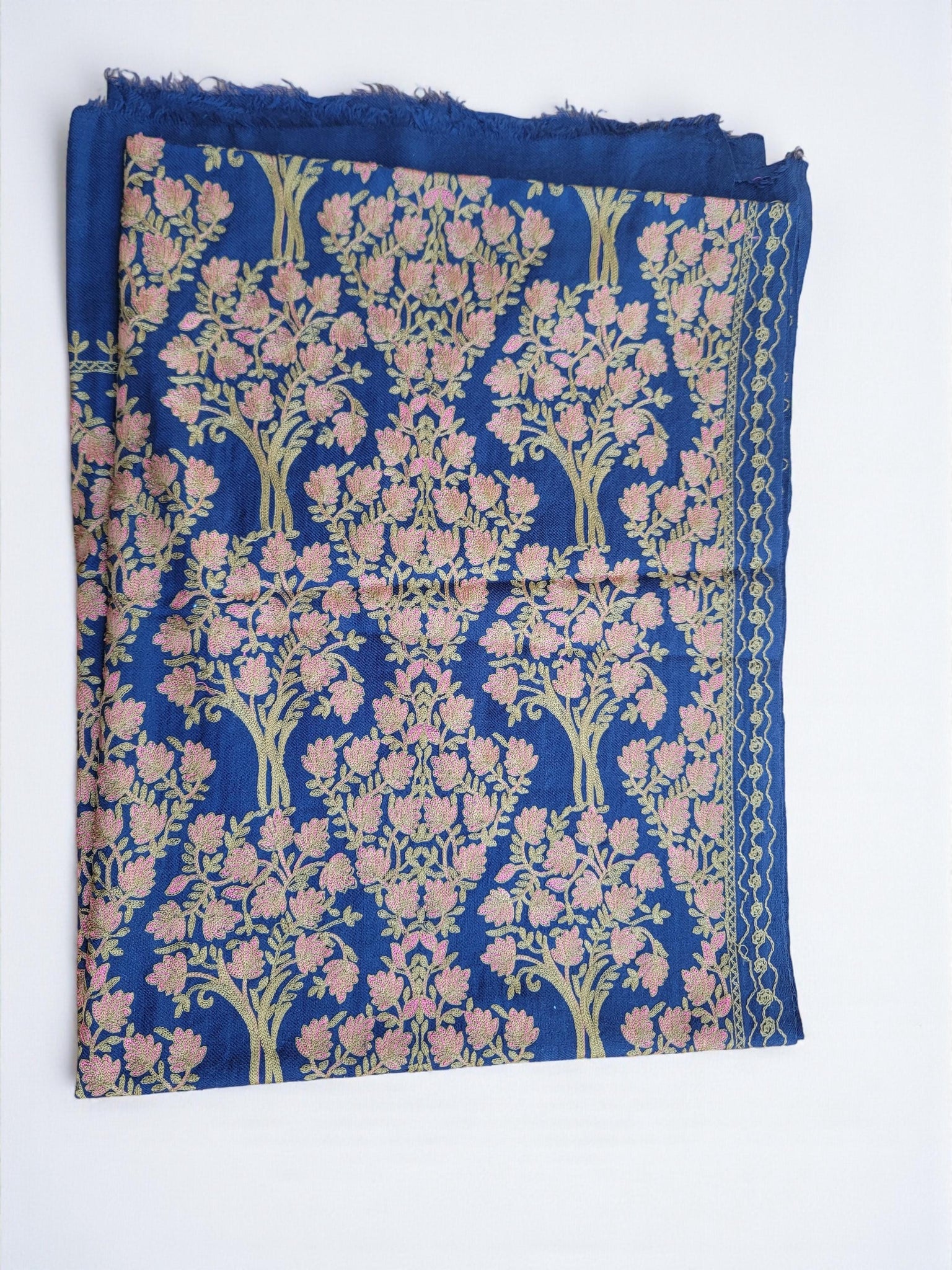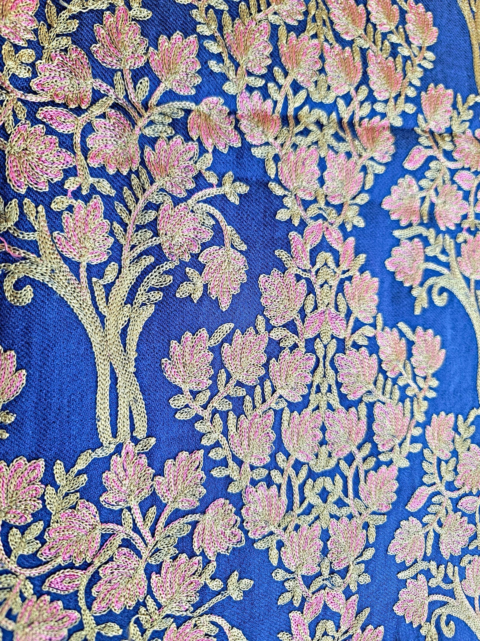 This stunning embroidered sky blue on navy blue Pashmina shawl is sure to make heads turn. The base of the shawl is Pashmina (cashmere) with silk thread embroidery on the whole body.T he border is kept un worked to create a beautiful contrast.