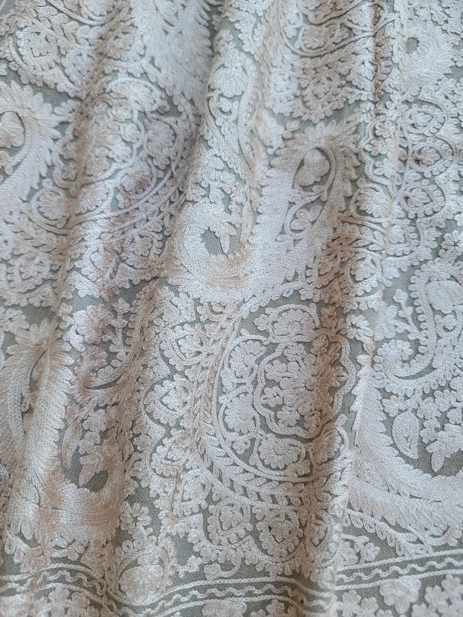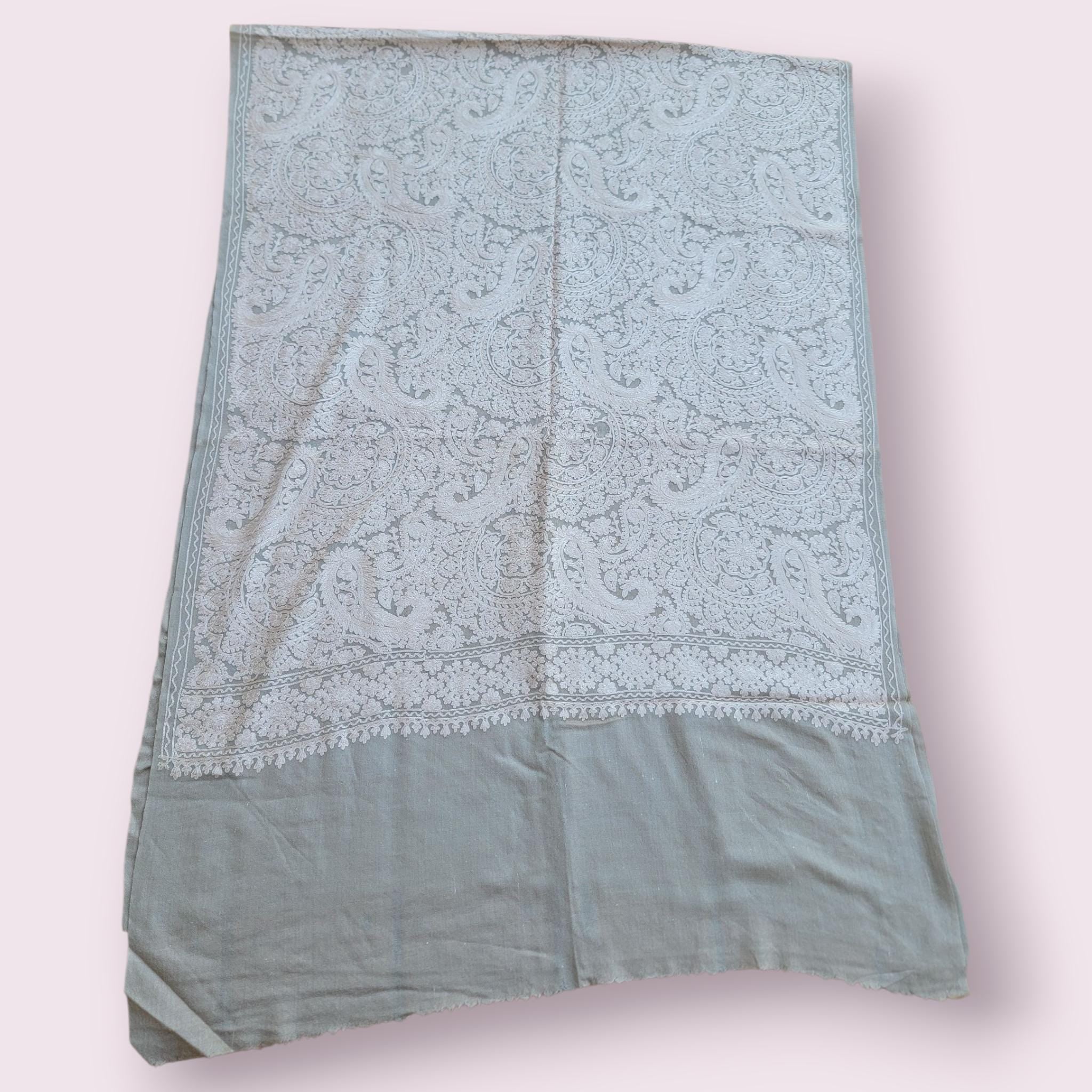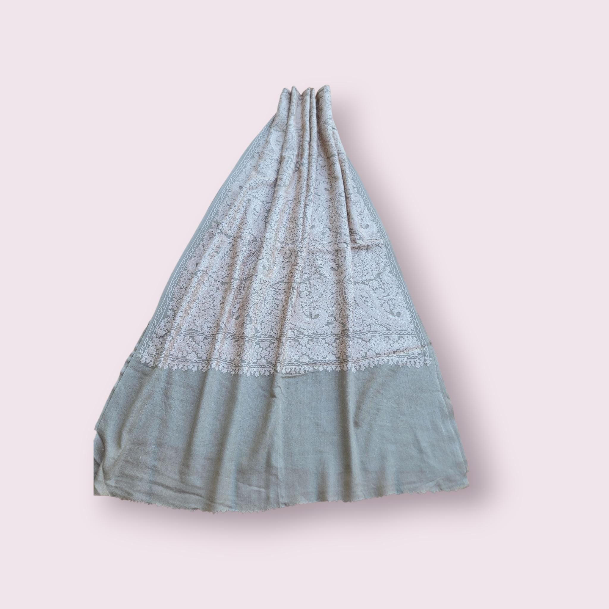 This stunning embroidered silver on Beige Pashmina shawl is sure to make heads turn. The base of the shawl is Pashmina (cashmere) with silk thread embroidery on the whole body.T he border is kept un worked to create a beautiful contrast.