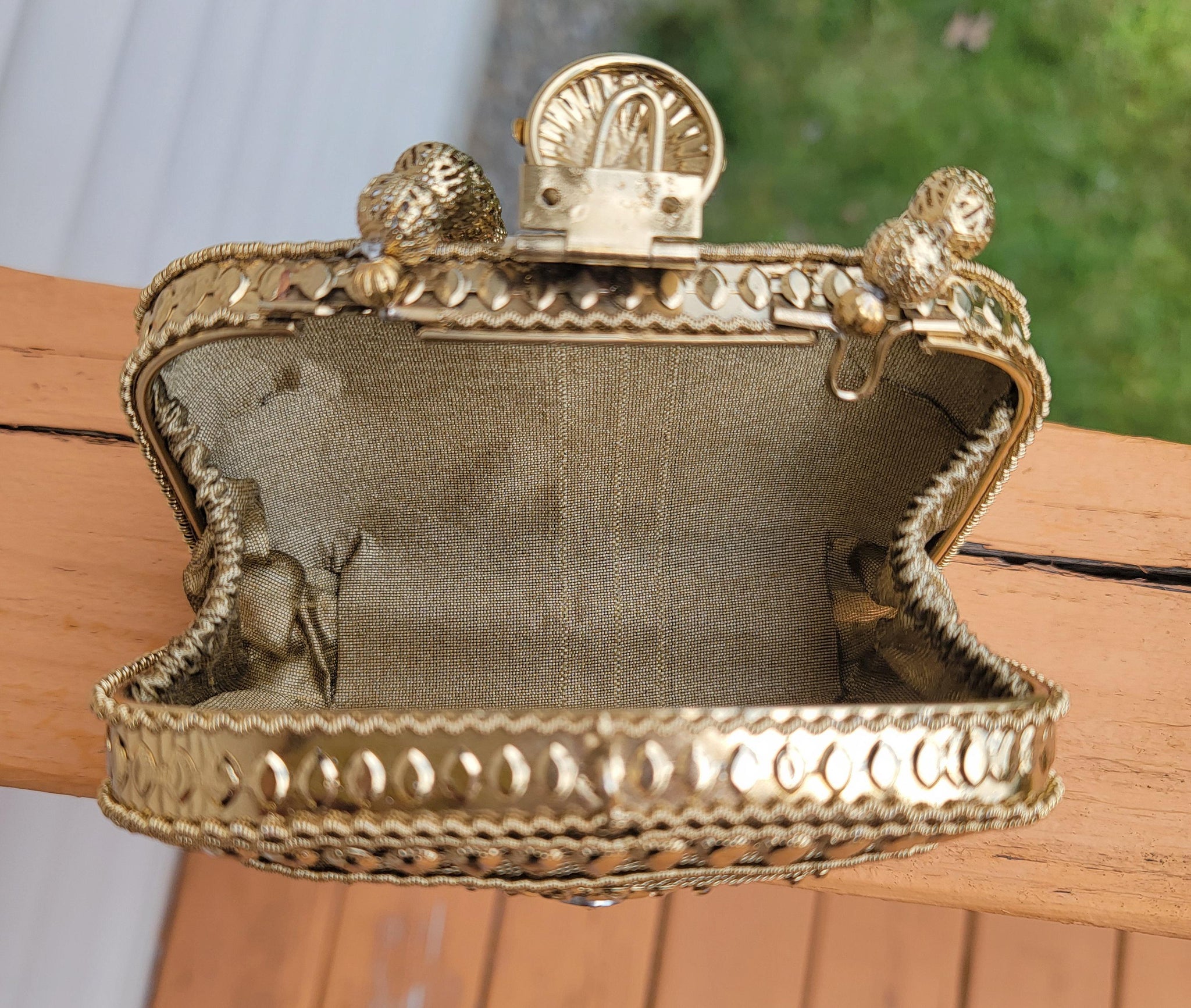This bag has intricate engravings with classic patterns that give it a vintage look. The engravings on this particular bag is hand hammered on the surface in gold tone on the front and two on the top opening of the clutch.