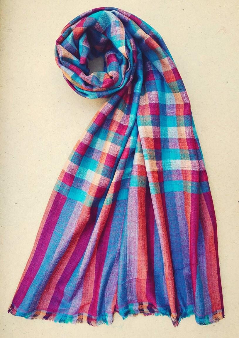 The first thing to consider a pure Cashmere shawl is the weight of the shawl or scarf.Pure Pashmina are feather light because of the material and the basket weave that goes in the construction.The weight of this product is only 4oz so it feels like feathers around you.