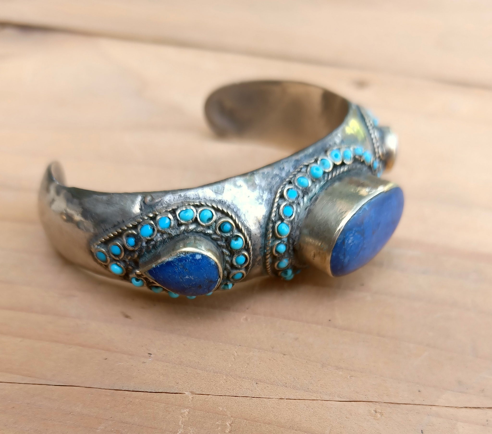 Gorgeous Blue lapis and turquoise silver wash cuff bracelet with blue turquoise beading all along the border of the beautiful red stone.