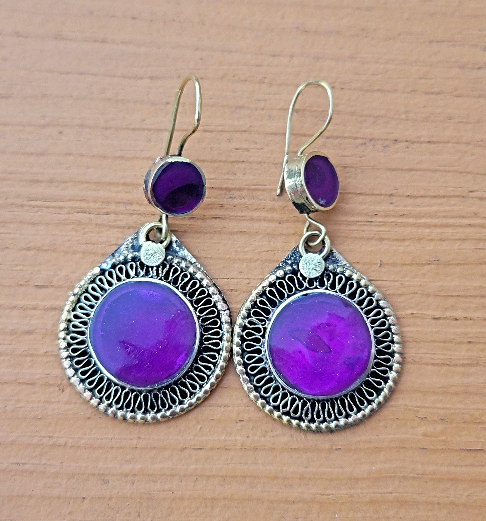 These beautiful over sized earrings were handcrafted in Northern Pakistan. The stones have a purple hue with a gorgeous shine