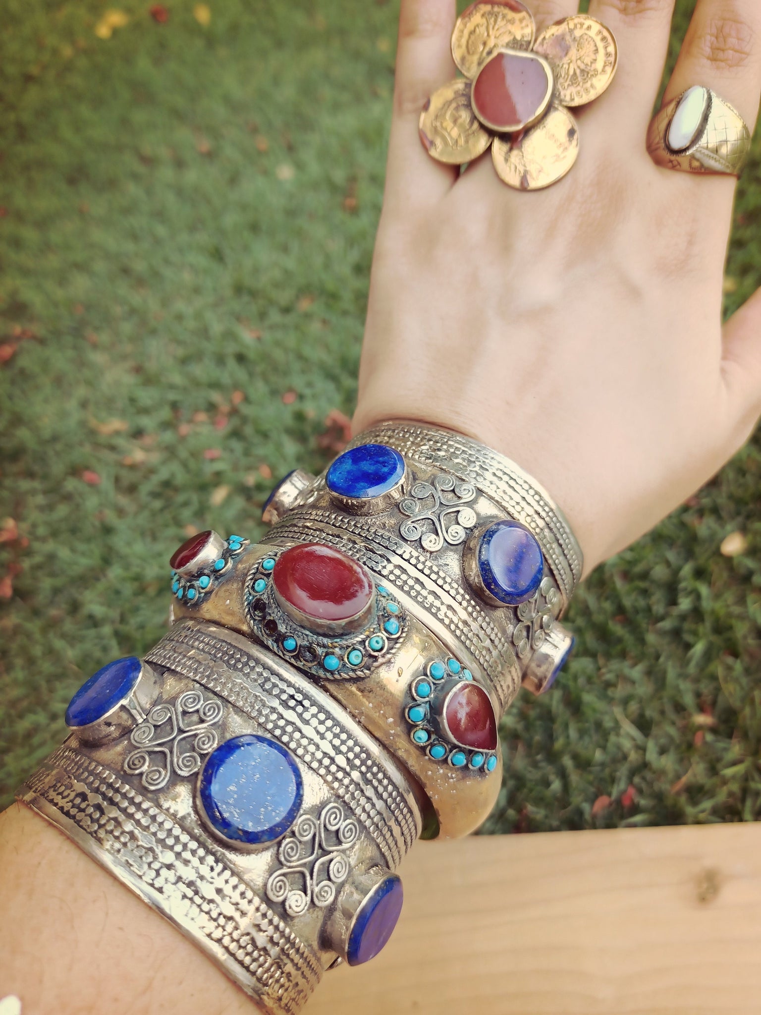 More beautiful than any other Kazakh cuff bracelet i have seen.Sturdy like a warrior cuff and gorgeous like a flower.The cuff listed is a very unique example of vintage royal jewelry.The main stone is a rich blue lapis lazuli.Surrounded by a beautiful row of turquoise and coral.