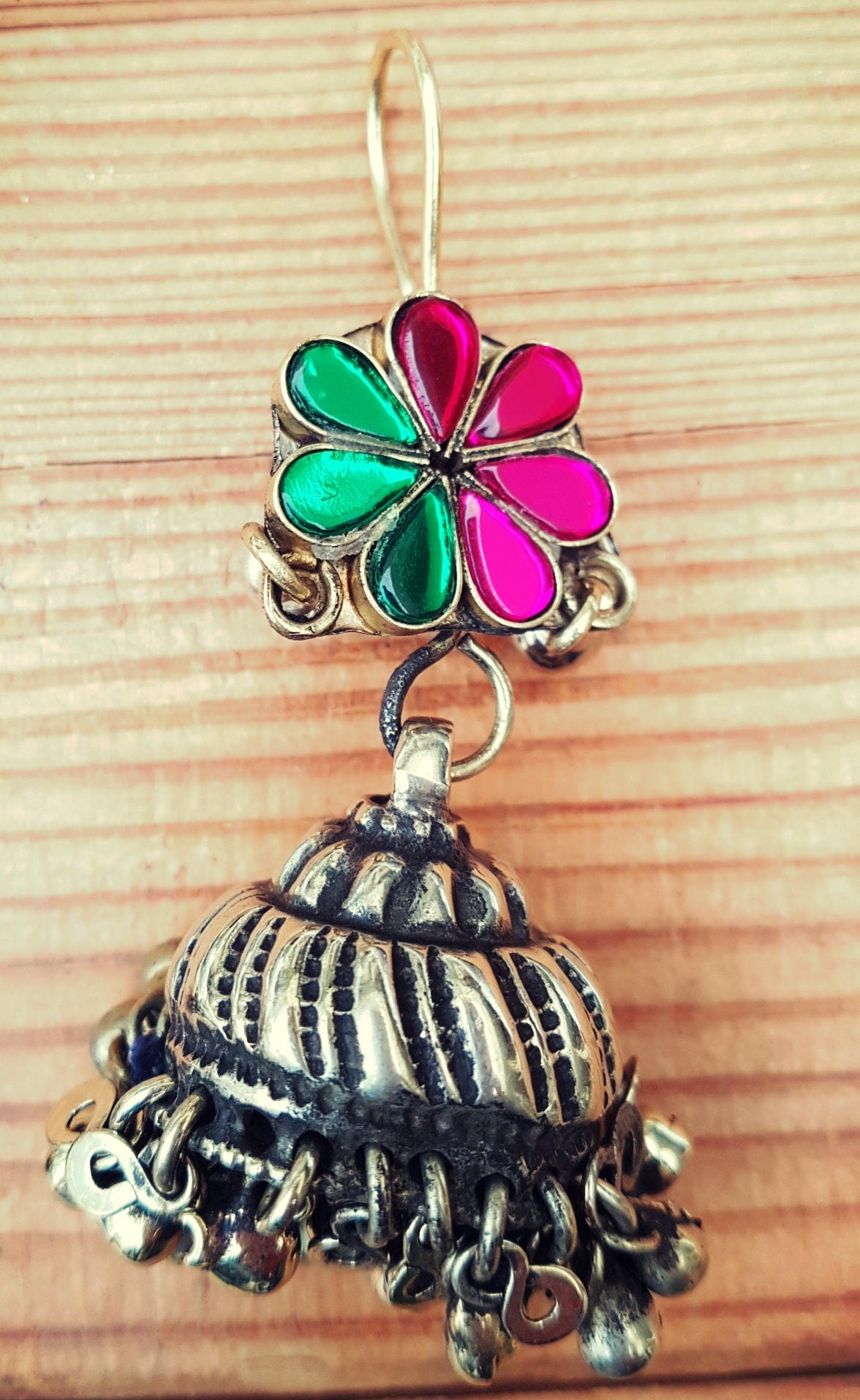 These small Vintage Kuchi Tribal Jewelry Earrings have a beautiful flower in rainbow colors celebrated throughout traditions since antiquity. The vibrant flowers on these beautiful vintage Kuchi Earrings are surrounded by colorful beads and tinkling bells for making an enchanting sound and scaring away demons. Warm age patina remains intact, mostly on back sides.
