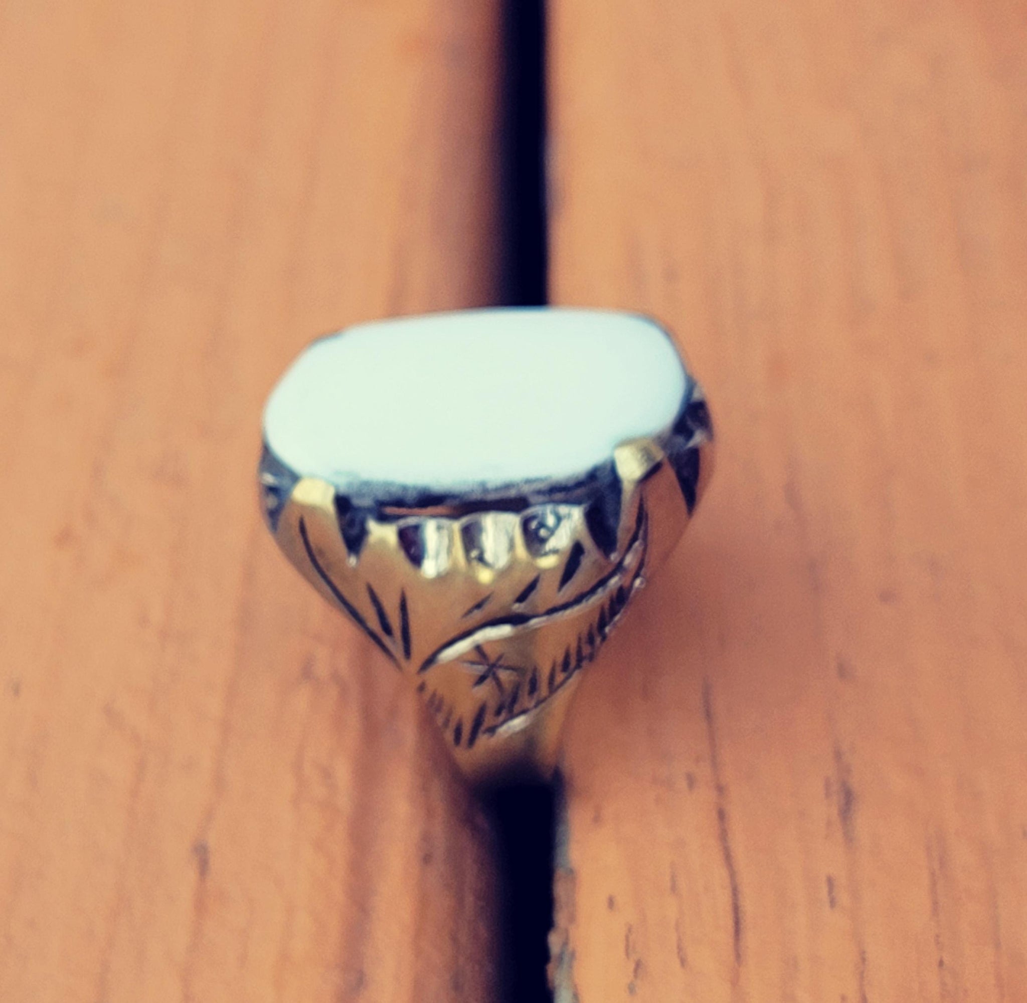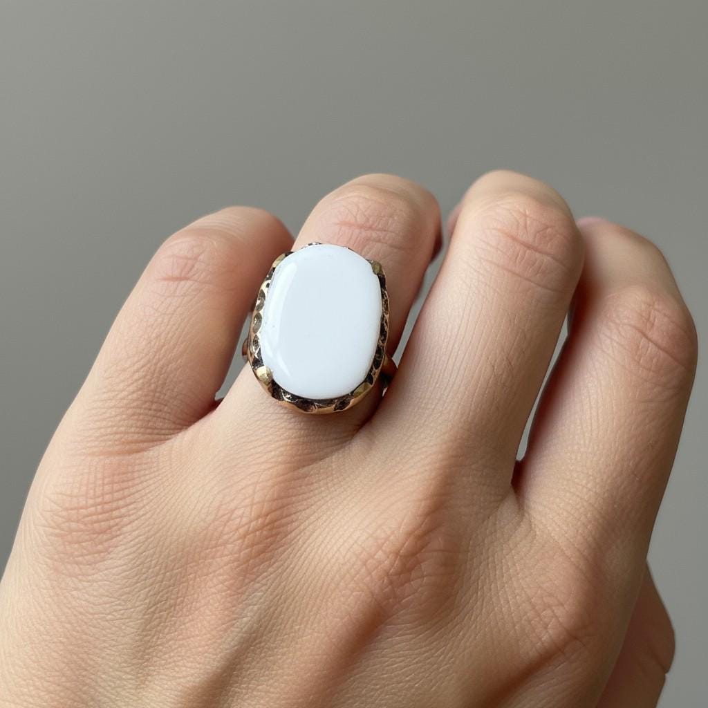 This beautiful ring featuring a stunning white onyx stone,surrounded by intricate carved webbing.